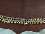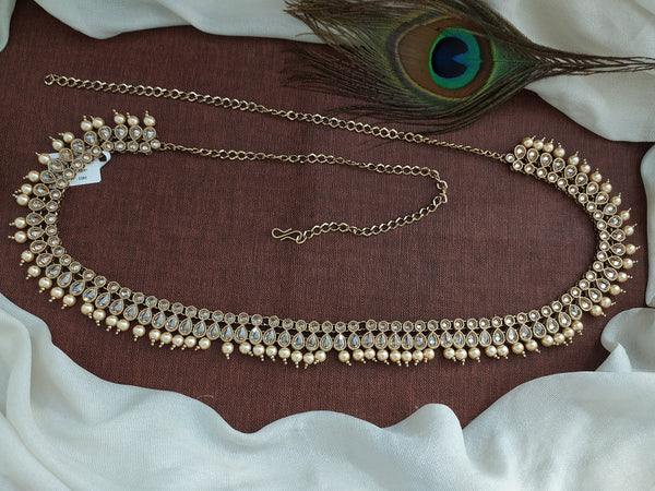 Enhance your elegance with this beautiful hip chain, designed to complement any look. The exquisite mehndi finish details, adorned with a captivating honey-colored stone and a delicate pearl drop, exude...