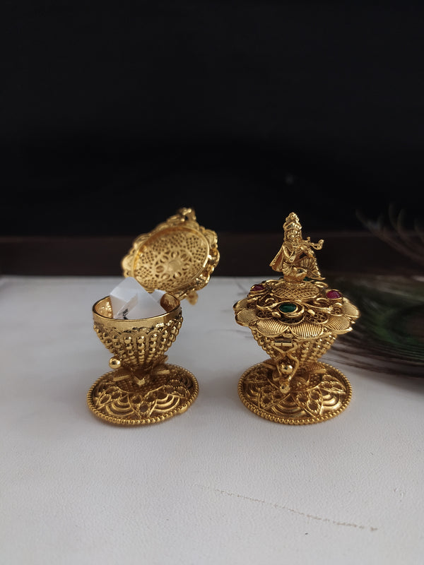 Expertly crafted from high-quality copper alloy, this Sindhoor Dabi features a captivating design of Lord Krishna seated gracefully at the top, adorned with Kemp stones. The intricate detailing and antique...