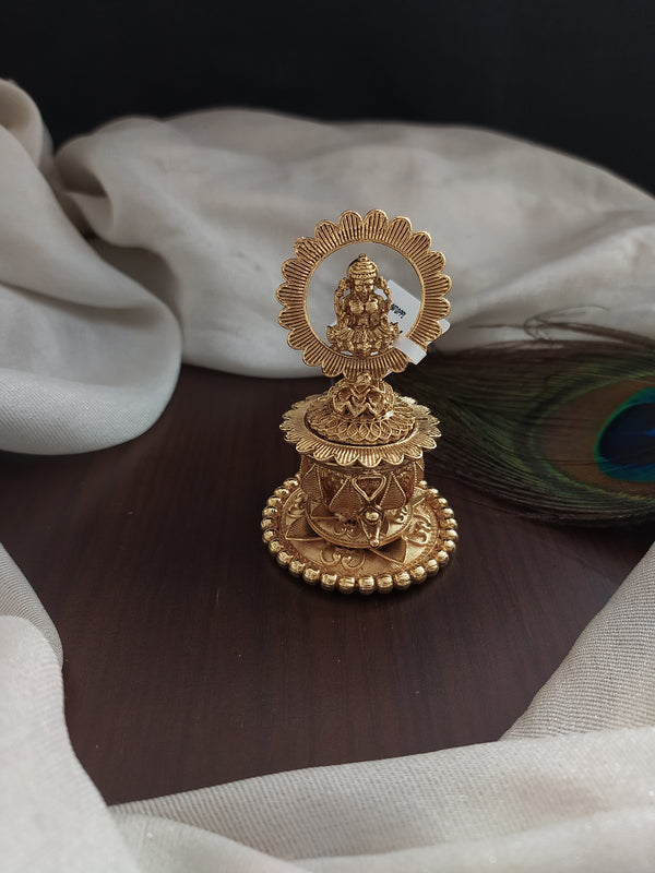 Crafted from high-quality copper alloy, this stunning Sindhoor Dabi showcases an elegant Lakshmi Ji motif at the top, symbolizing prosperity and grace. Embellished with intricate Kemp stones, this piece is perfect for festive occasions or as a thoughtful gift for loved ones. The blend of antique finish and traditional design brings an authentic cultural charm, making it an exquisite accessory for traditional ensembles.