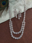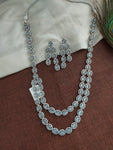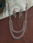It features two layers of delicate chains or strands, each hanging longer than the other, creating a layered effect. The set may include a necklace with two chains or a combination of necklace and matching earrings.