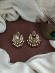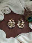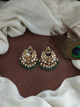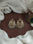 Exquisite Victorian-style chandbali earrings adorned with sparkling Moissanite stones and delicate Swarovski pearl drops. These earrings feature a small Lakshmi motif at the center, offering a graceful blend of tradition and elegance. Available in six beautiful colors – Green, Red, White, Mint, Violet, and Baby Pink – perfect for festive occasions and wedding functions.