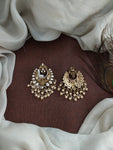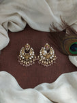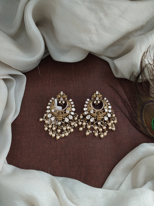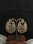 Exquisite Victorian-style chandbali earrings adorned with sparkling Moissanite stones and delicate Swarovski pearl drops. These earrings feature a small Lakshmi motif at the center, offering a graceful blend of tradition...