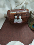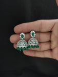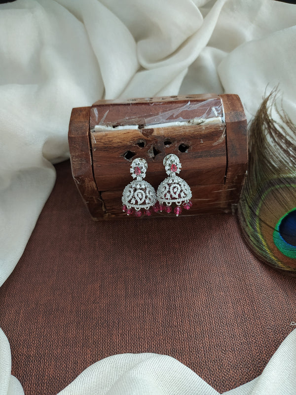 Charming mini jhumkis in a sleek silver (rhodium) finish, crafted with vibrant color stones and delicate bead hangings. Available in three beautiful colors – ruby, baby pink, and green. Perfect for everyday elegance or festive flair. Push back closure for comfort and ease.