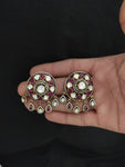 Add a touch of timeless elegance to your collection with these Pure Silver Moissanite Ruby Studs. Crafted in 92.5 pure silver, these designer studs feature a striking combination of ruby moissanite stones with white accents. The standout feature is the delicate pear-shaped stone danglings that add a graceful movement and sophistication to the design.