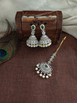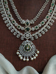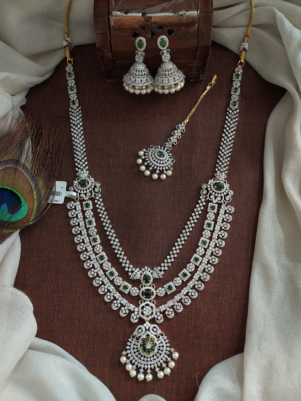 An exquisite zircon layered necklace set crafted with emerald and white premium CZ stones, giving a luxurious diamond-like shine. Ideal for weddings, festive occasions, and traditional attire. Comes with matching earrings for a complete elegant look.