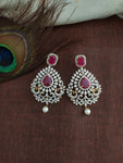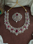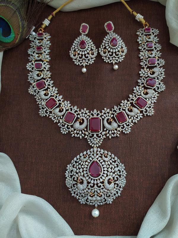 Elegant zircon long haram set in gold diamond finish, crafted with sparkling CZ stones. Designed with a detachable pendant, allowing two styles – wear it with the pendant for a grand look or without for a sleek and simple style. The pendant features a striking ruby stone at the center, surrounded by white zircons, and comes with matching earrings. Perfect for weddings, receptions, or festive occasions.