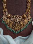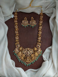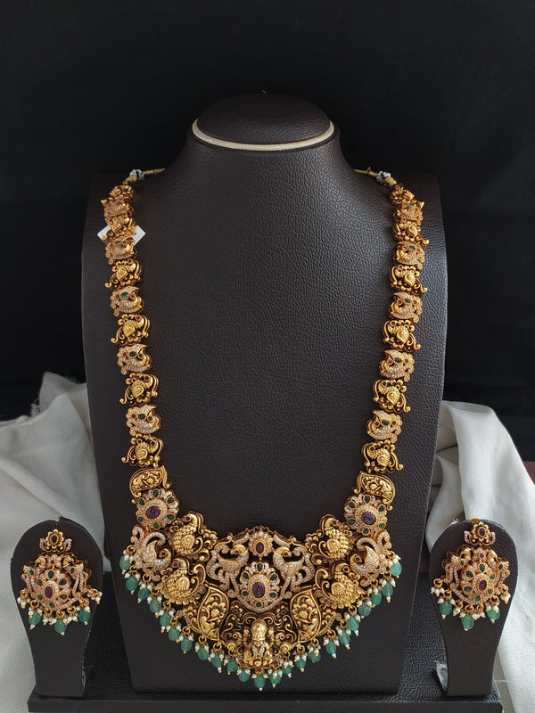 A majestic antique gold-plated long haram set featuring intricate Nakshi work with Goddess Lakshmi and peacock motifs, beautifully adorned with fine zircon detailing. This statement piece includes a long haram...