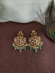 A majestic antique gold-plated long haram set featuring intricate Nakshi work with Goddess Lakshmi and peacock motifs, beautifully adorned with fine zircon detailing. This statement piece includes a long haram necklace with matching earrings, reflecting traditional craftsmanship and divine elegance — perfect for bridal, festive, or temple occasions.