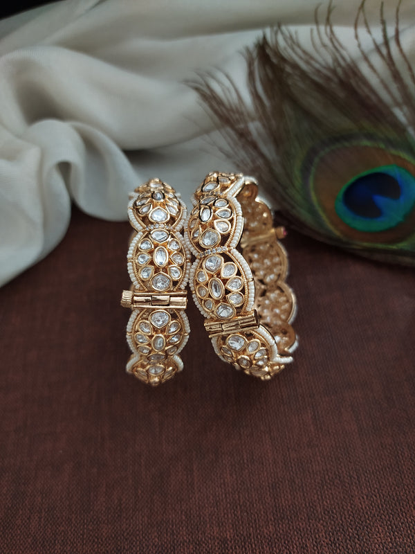 Embrace timeless elegance and the brilliance of fire with the captivating Gold Plated Moissanite Stones Screw Kundan Bangles from Sonal Fashion. Part of our coveted Gold Plated Kundan / Moissanite Collection, these exquisite bangles feature a mesmerizing design, meticulously crafted and adorned with stunning moissanite stones set against a gleaming gold plated finish. The screw closure ensures a secure and comfortable fit for wrists of various sizes.