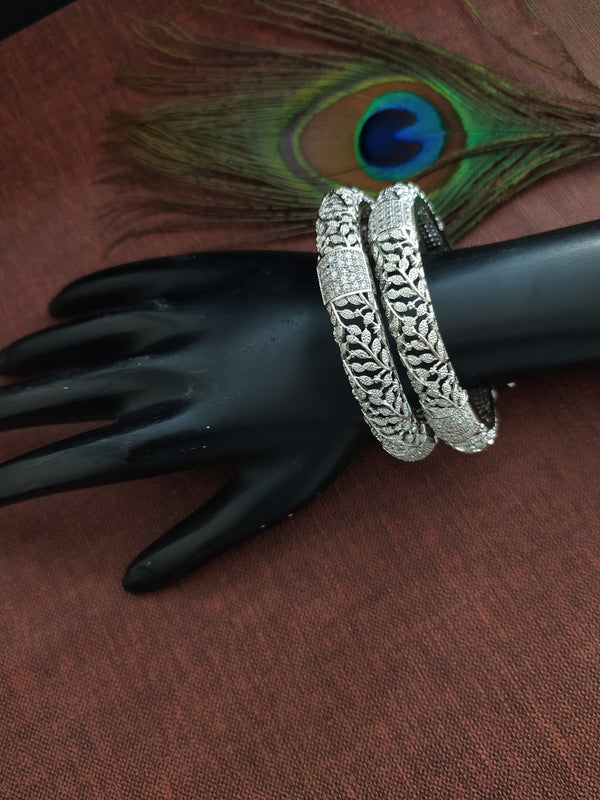 The Magnificent Leaves Design Silver Plated Zircon Bangles are a must-have for any jewelry collection. Crafted with high-quality materials, these bangles feature a stunning leaf design adorned with sparkling zircon stones.