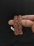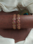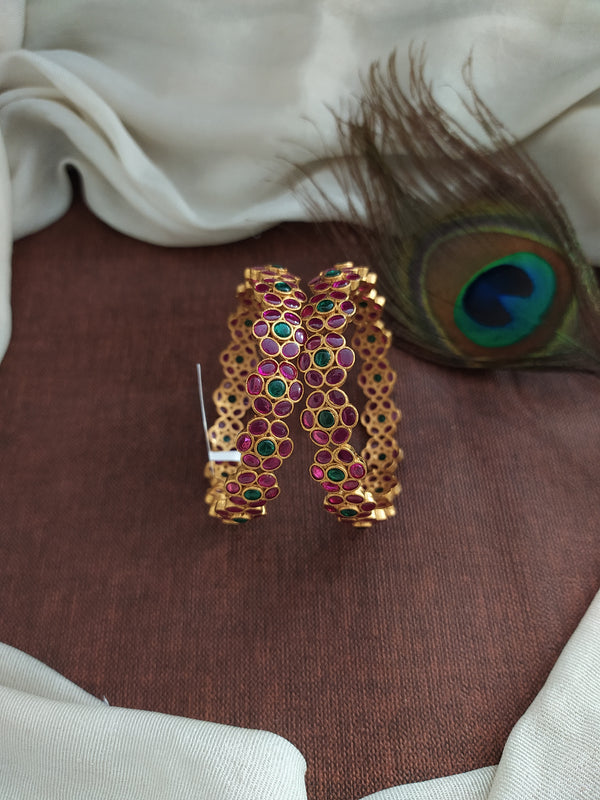 Add a touch of traditional elegance with our Floral Design Kemp Stone Bangles, featuring intricate floral motifs adorned with vibrant Kemp stones and central green stones. These bangles are crafted to bring out the rich essence of South Indian heritage, making them a must-have for any ethnic jewelry collection.