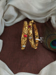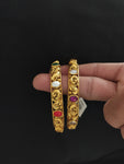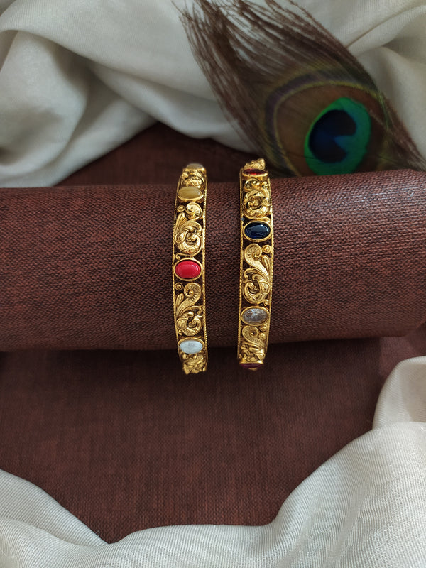 Traditional antique-finish bangles with intricate nakshi work, adorned with Navaratna stones. These bangles are crafted without any goddess motifs, making them versatile and elegant. Available in sizes 2.4, 2.6, and...