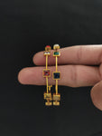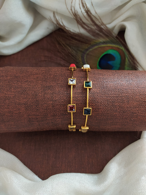 Sleek and elegant Navaratna bangles designed with a minimal aesthetic and studded with nine colorful stones. A perfect blend of tradition and simplicity, ideal for daily wear, festive styling, or as a subtle accent to bridal looks. Available in sizes 2.4, 2.6, and 2.8.