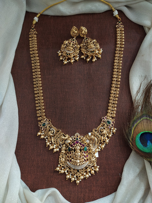 A majestic Antique Lakshmi long haram set beautifully styled in a V-shaped silhouette to create a wider, grander neckline presence. Featuring a classic Lakshmi motif with intricate antique detailing, this...