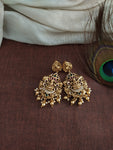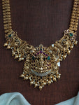 A majestic Antique Lakshmi long haram set beautifully styled in a V-shaped silhouette to create a wider, grander neckline presence. Featuring a classic Lakshmi motif with intricate antique detailing, this design enhances traditional looks with depth and elegance. Ideal for weddings, temple functions, and festive occasions, it pairs effortlessly with silk sarees and bridal ensembles for a rich, heritage finish.