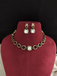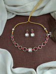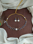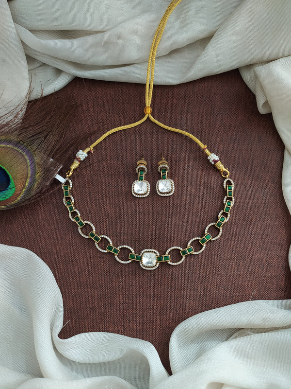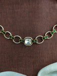 A sleek and elegant close-neck necklace crafted with kundan and moissanite stones, blending tradition with modern design. Available in three vibrant colors – green, ruby, and blue – this versatile piece is perfect for weddings, receptions, and festive occasions. Comes with matching earrings.