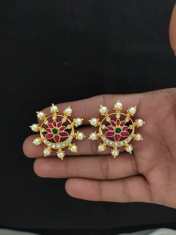 • Design: Crafted with intricate Jadau Kundan work, these studs are adorned with lustrous pearls for an elegant finish.
