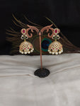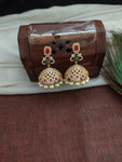 Step into the spotlight with grace and elegance as you don this exquisite gold-plated jhumka, a dazzling statement piece designed for those special moments. Brilliantly adorned with shimmering Zircon stones that radiate opulence, it boasts a breathtaking pearl drop that adds a touch of finesse. The vibrant red and green color combination makes this jhumka truly one-of-a-kind, adding a captivating flair to any outfit. With its convenient push-back closure, comfort and style harmoniously unite in this luxurious jewelry piece. Elevate your ensemble to new heights of sophistication and allure, capturing the admiration of all who behold its mesmerizing beauty.