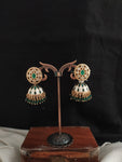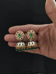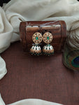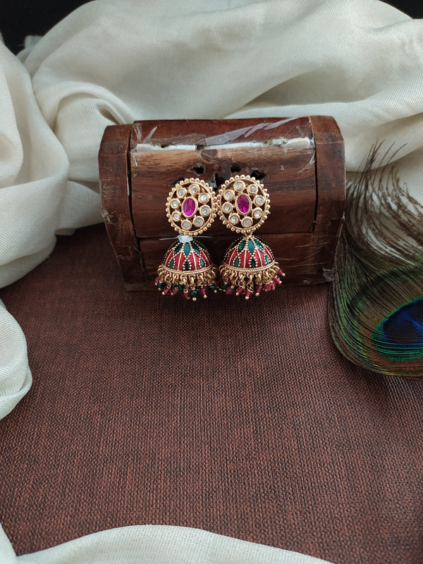 Elegant Kundan Jhumki earrings crafted with intricate Meenakari enamel work. These beautiful earrings come in two vibrant color combinations — red with green, and green. Perfect to pair with both traditional and festive outfits, they bring a royal touch to your overall look.