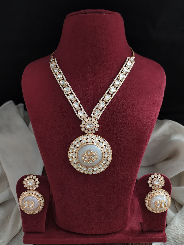 Celebrate Diwali in style with this Classic Kundan Circular Pendant Necklace Set, featuring an intricate floral design. Crafted with meticulous detail, the pendant showcases the beauty of Kundan stones, arranged in...