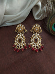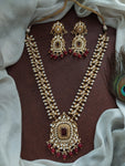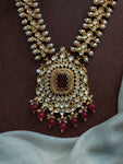 This Antique Long Haram Set exudes timeless elegance, crafted without any deity motifs, allowing the intricate artistry to shine. The haram features white Kundan stones throughout the design, highlighting the luminous brilliance of traditional craftsmanship. At the center, ruby quartz stones create a striking focal point, complemented by ruby beads and delicate pearl drops adorning both the haram and matching earrings.