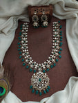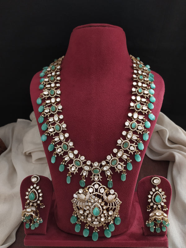 Available in five exquisite colors — Pastel Mint, Ruby, Violet, Green, and White, this long haram complements a variety of bridal and festive outfits. The intricate detailing and Victorian-inspired design make it an ideal choice for brides seeking sophistication and sparkle.