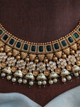 The Kundan Bridal Choker/Necklace Set is a perfect blend of antique charm and modern Kundan craftsmanship. Designed with intricate floral motifs in antique shades and adorned with dazzling Kundan stones, this set is the ideal choice for brides looking to make a statement on their special day. Available in two captivating colors – green and baby pink – this set includes a choker, matching earrings, a tikka, a nath, and adjustable rings, ensuring a complete and coordinated bridal ensemble. The combination of antique detailing with the vibrant sparkle of Kundan stones gives this set a timeless yet fresh appeal, making it a versatile addition to bridal or festive wardrobes.
