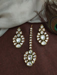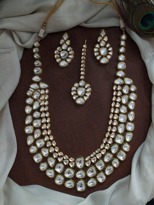 Exude regal charm on your special day with this Polki Kundan Bridal Haram Set, a luxurious creation featuring unshaped Kundan stones intricately adorned with delicate enamel work along the sides of the stones. The combination of traditional craftsmanship and modern finesse makes this haram set a timeless addition to your bridal trousseau. The set includes matching earrings and a stunning maang tikka, completing your look with elegance and grace.