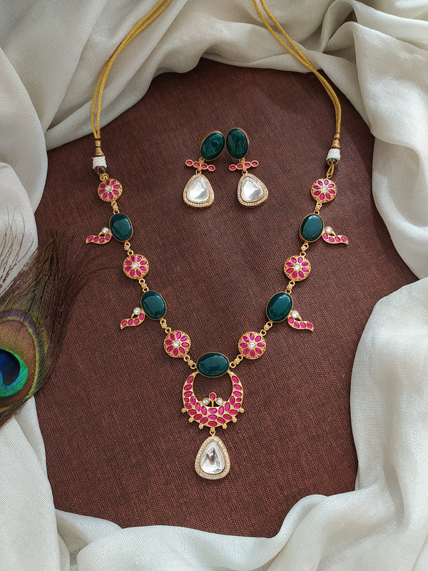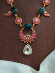 An opulent Polki Jadau Necklace Set, intricately crafted with semi-precious quartz and Jadau Kundan stones for a royal touch. Featuring a rich color combination of green, red, and white, this set...