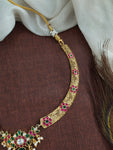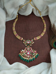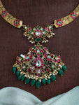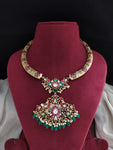 A stunning Jadau Kundan Hasli / Kanti Necklace, featuring an intricately crafted peacock-designed center pendant. The necklace is adorned with premium Jadau Kundan stones in red, green, and white, giving it a regal and traditional look. The elegant Hasli/Kanti style sits gracefully on the neck, making it perfect for weddings, festive occasions, and cultural celebrations.