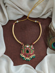 A stunning Jadau Kundan Hasli / Kanti Necklace, featuring an intricately crafted peacock-designed center pendant. The necklace is adorned with premium Jadau Kundan stones in red, green, and white, giving it a regal and traditional look. The elegant Hasli/Kanti style sits gracefully on the neck, making it perfect for weddings, festive occasions, and cultural celebrations.