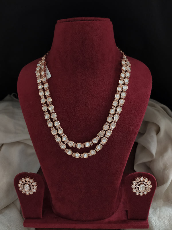 Elevate your jewelry game with our Rose Gold Double Layer Necklace Set with Matching Studs. The delicate design and rose gold finish make this set a modern classic. The necklace features two layers of uncut diamonds, adding a touch of glamour and sparkle to