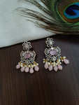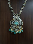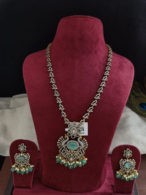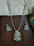 This Victorian-style long set is a beautiful and elegant jewelry item that features a double peacock design. The set includes a necklace and matching earrings, both crafted with intricate detailing and a touch of vintage charm.