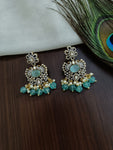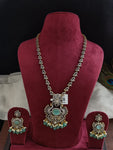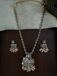 The necklace is designed in a long style that rests gracefully on the chest. The double peacock design is intricately crafted with precision, and the details are enhanced with the use of gold-toned metal. The earrings are similarly designed with a matching peacock motif, creating a cohesive and polished look.