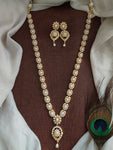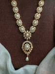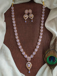 An elegant AD long haram set crafted with real color semi-precious stones, designed to give a rich and graceful statement look. Available in sophisticated shades of Full Coral, Full Black, Lavender, and Pearl, this long necklace brings effortless charm to festive, wedding, and occasion wear. A timeless piece that pairs beautifully with sarees, lehengas, and ethnic ensembles.