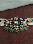 The choker features a stunning silver monzonite stone at the center, surrounded by delicate pearls that add a touch of femininity to the piece.