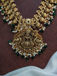 Bejewelled in history and radiating elegance, this captivating long haram set from our Antique Nagas Collection is a true masterpiece. Featuring a stunning Goddess Lakshmi pendant crafted from kemp stones, this set embodies prosperity, grace, and timeless beauty.