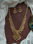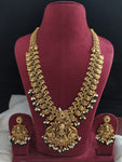 - Goddess Lakshmi Pendant: The centerpiece of this long haram is a majestic pendant depicting Goddess Lakshmi, the embodiment of auspiciousness, fortune, and abundance.