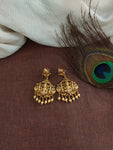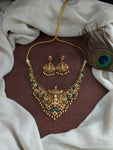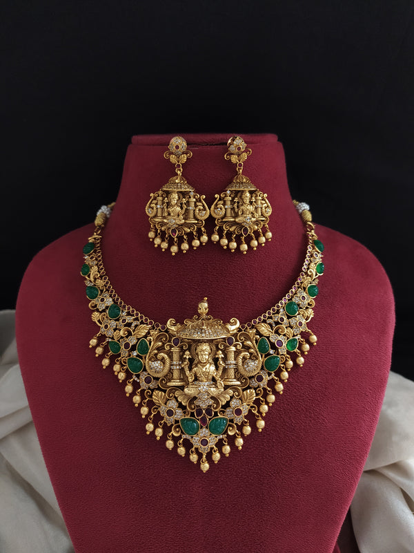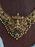 A traditional antique Nakshi work Lakshmi necklace set crafted with green stones surrounded by sparkling white zircons and kemp stones. Finished with golden ball hangings for a classic touch, this set comes with matching earrings. Perfect for weddings, festive occasions, and temple jewellery lovers.