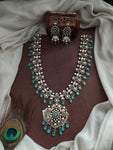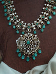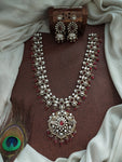 Available in five exquisite colors — Pastel Mint, Ruby, Violet, Green, and White, this long haram complements a variety of bridal and festive outfits. The intricate detailing and Victorian-inspired design make it an ideal choice for brides seeking sophistication and sparkle.