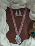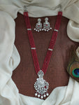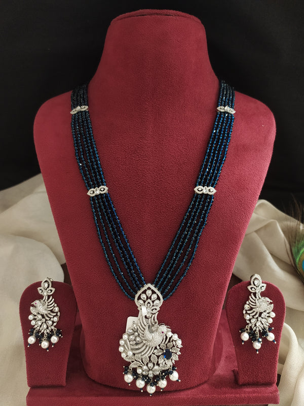 Long CZ beads zircon mala set featuring a stunning peacock design pendant with matching earrings. Crafted to mirror diamond brilliance, this set is available in four exquisite colors: Sapphire Blue, Ruby Red, Baby Pink, and Black. A perfect pick for festive, party wear, or a designer saree.