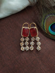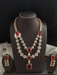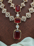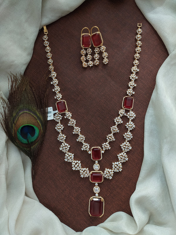 Matching Earrings: The set is completed with matching earrings, designed to mirror the elegance of the haram. The earrings feature the same combination of ruby and white zircon stones, ensuring a cohesive and polished look.