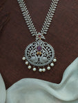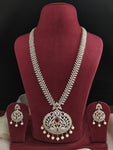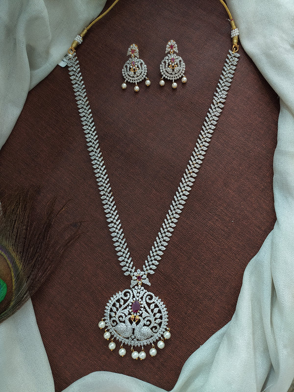 Indulge in the timeless elegance, cultural heritage, and sparkling brilliance of the Gold & Silver Plated Peacock Pendant Zircon Haram Set from Sonal Fashion. Add a touch of sophisticated versatility and a majestic statement piece to your collection today!