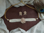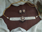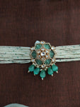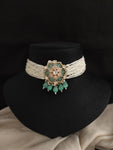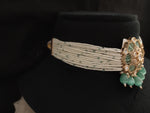Description: Adorn yourself with the regal beauty of our Exquisite Kundan Pearl Choker Set. Featuring a stunning floral design pendant at the center, this set is embellished with radiant Kundan stones and delicate pearl drops, epitomizing timeless elegance. Available in various colors—Mint, Baby Pink, White, Violet, and Blue—this choker set offers versatile options to match any outfit. Complete with matching studs, each piece in this set is handcrafted with precision, making it a perfect choice for weddings, parties, or any special occasion. Embrace the luxurious charm of traditional craftsmanship with this unique and captivating jewelry set.