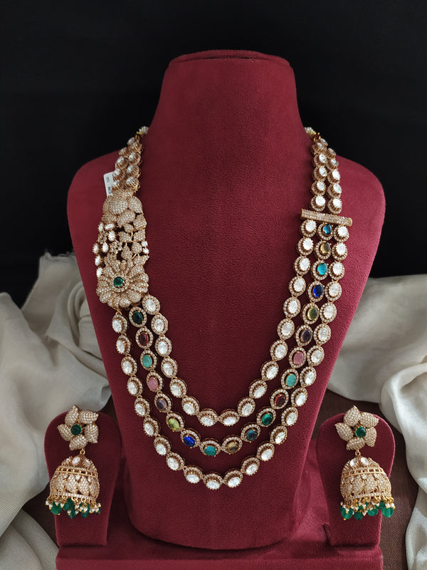 Each set comes with matching jhumki earrings, perfectly complementing the grand, multi-layered design. Whether for bridal wear, festive occasions, or upscale events, this set adds a timeless touch of opulence to any attire.