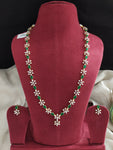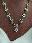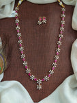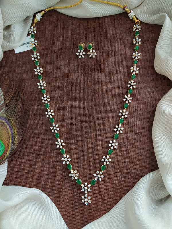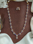 A timeless Nakshatra design long haram set in diamond finish, crafted with CZ stones for an elegant diamond-like sparkle. Available in three classic colors – Green, Ruby, and Violet. Perfect to pair with silk sarees, festive wear, or traditional occasions. Comes with matching earrings.