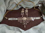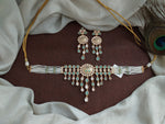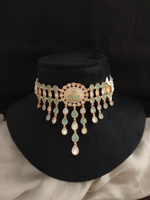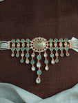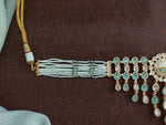 Discover the exquisite allure of our Uncut Kundan Diamond Pearl Choker Set. This stunning piece is meticulously crafted with uncut diamond stones, featuring intricate meenakari work at the center. The choker is adorned with pear-shaped danglings at the bottom, creating an elegant and sophisticated look. Complemented by matching dangling earrings, this set is available in two soft pastel colors: mint and baby pink. Perfect for special occasions, this choker set effortlessly combines traditional craftsmanship with contemporary elegance, making it a must-have addition to your jewelry collection.
