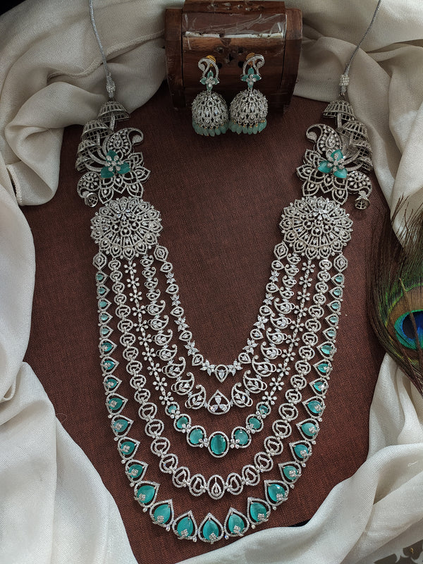 Elevate your bridal elegance with this stunning Zircon Layered Bridal Haram Set, available in the soft, ethereal tones of Pastel Mint and Baby Pink. Crafted meticulously with fine zircon stones, this haram set features layered designs that offer a royal look perfect for bridal wear. Each set is paired with intricately designed matching jhumki earrings, completing the opulent aesthetic.