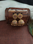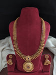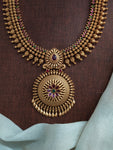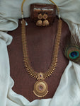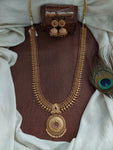 A timeless matt antique long haram set crafted in classic temple jewellery style without goddess motifs. Designed with intricate detailing, this versatile piece comes with matching earrings, making it perfect...