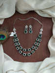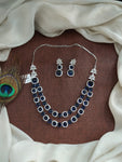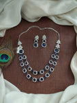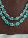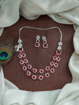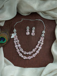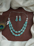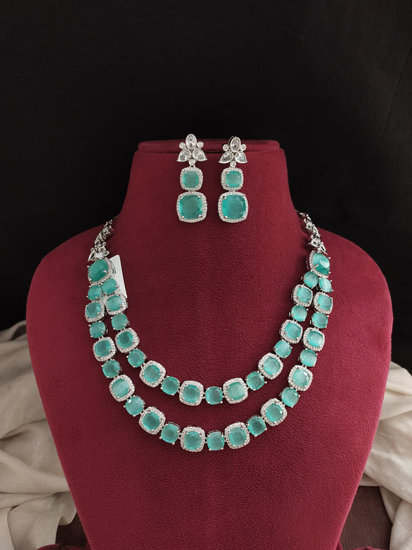 This stunning Double Layered AD Necklace Set is crafted in a sleek rhodium (silver) finish for a refined, diamond-like sparkle. Adorned with high-quality zircon and AD stones, the necklace is available in a range of vibrant colors including Mint, Baby Pink, Red, Green, Blue, and Violet. Each set comes with a matching pair of earrings, making it a perfect choice for festive occasions, weddings, or party wear.